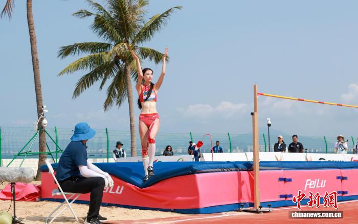 4月26日,三亚亚沙会女子跳高决赛中,胡麟鹏正在比赛。华体会报道记者 贾天勇 摄