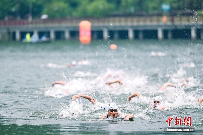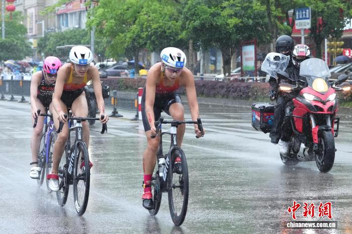 随后进行的女子优秀组比赛中,雨势陡然增大,给选手们带来了更大挑战。中国选手杨一凡纵身跃入湖水中,顶着雨水奋力劈波斩浪。与男子组自行车赛段一样,女子组的竞争也同样激烈,杨一凡等三名选手冲在第一方阵,交替领骑,始终没有拉开太大差距。最终,杨一凡以2小时2分53秒的成绩锁定女子优秀组冠军。